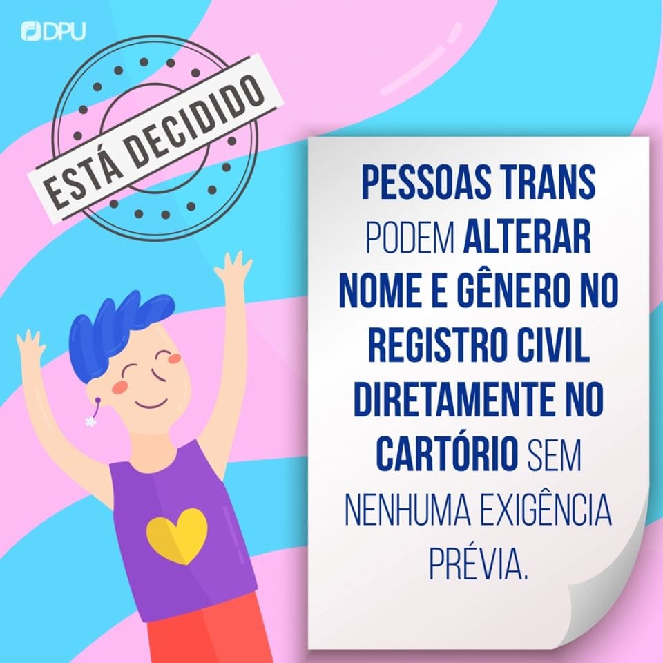 #PraCegoVer O fundo da imagem traz listras nas cores rosa e azul claro, representando a bandeira Trans. À esquerda, na parte superior, há um selo onde se lê “Está decidido”. Abaixo, uma pessoa sorri com os braços erguidos. Ela tem cabelo azul e veste camiseta roxa com um coração amarelo estampado e calça vermelha. À direita, lê-se, em letras azuis sobre fundo branco imitando uma folha de papel: “Pessoas trans podem alterar nome e gênero no registro civil diretamente no cartório sem nenhuma exigência prévia”.